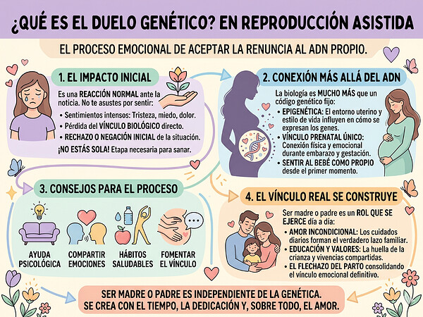 El duelo genéticoes el proceso emocional de aceptación de la pérdida del vínculo biológico directo con el futuro hijo. Renunciar a que tu bebé lleve tus rasgos físicos o tu herencia biológica puede generar sentimientos intensos de: